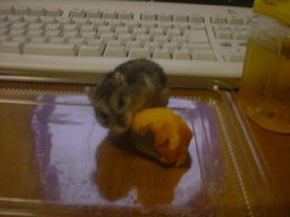 「帰ったよー。」 と話しかけると、ケージから出てきて座っているぼくの膝に登ってきて「何かくれ」とでも言うように2本足でスタンディング。パンを買ってきてたので少しちぎって与えると、もしゃもしゃ喰らっておりました。ま、元気そうで何より。よかったよかった。