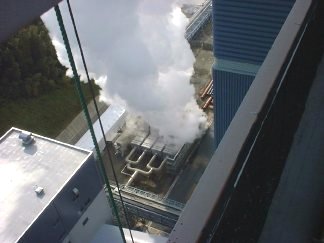 写真の蒸気が出ているところがその出口。この中にゴミとかを溜めるんだろう。これは仮設の設備で、今はもう無い。2号機は6ヶ月位の差で工事が進められているから、このフリーブローが行われるのは2000年の春ぐらいかなあ。