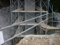 急遽我々は土工に変身し、角スコ持ってひたすら砂のけ作業に励んだのであります。小一時間この作業を続けて、やっと墨が打てるようになり一安心。乾いてないからちょっとツライものがあったけど、なんとかクリアしました。