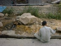 橋そばの河原でヘルメットを洗うやいさん。お疲れ様でした!(そんなに疲れてないか。(笑))