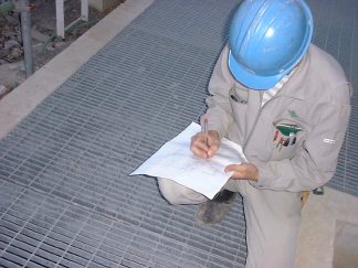 作業場所に来て、なるほどと納得。グレーチング下の溝の計測でした。上を選んでいれば、グレーチングの上から配管と溝の底までスケールを下ろしての計測。んで、下の方は溝をとことこ歩きながら溝の幅と配管位置の計測。上が当たりだった〜。