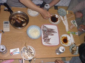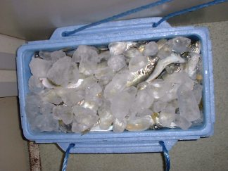 こんなに釣ってど〜すんの?って言うくらい釣れた。おびただしいアジ・アジ・アジ! 「皆さばくん?」 「とりあえず食う分だけな。」 「のこりは?・・・・・・まさか」 「T林さんにやる。」 「あっそう。」 捨てるのかと思ってちょっとひやっとしたが、ほっと安心。 やっぱり新鮮なアジの刺身はうまいよな〜。今日はかっちゃん製煮付け付き! いただきま〜す。そして乾杯。 こちらはT林さん行きのアジ達。おやすみなさい。 (BACK) (NEXT)