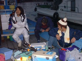 途中釣具屋で仕掛けと撒き餌、エサを買い、港近くでSさんと合流した。今回は渡船で一文字という波止場に渡っての釣行だ。Mくんちょっとねむたそう。Sさんは仕掛け作りに専念している。