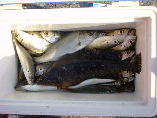 Mくんのヒットを皮切りに、アジが群をなしてやって来てしばらく入れ食い状態が続いた。やいさんが仕掛けをさびきにかえてやってみたらもう鈴なりで、クーラーにみるみるアジがたまっていく。
