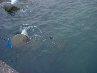 大物が釣れたときのためにタモを準備し、魚が水面に顔を出すのを待った。二人がリールを同時に巻いていたが、途中二人の糸が絡まっている。どっちの獲物だ?