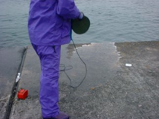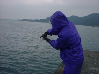 散らばった撒き餌をバケツできれいに洗い流すやいさん。