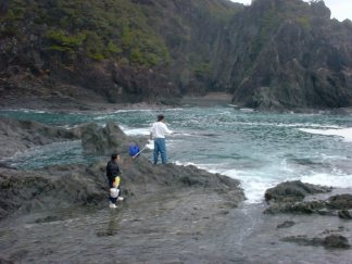 今日は風はそんなにないが、波がある。移動時に足が波で洗われたりしたけど、長靴を履いてきたから大丈夫。といって油断は禁物。磯では海苔とか海草、藻が岩についてるトコがあって、その上を歩くと滑りやすい。スパイク靴なら平気なんだろうけどね。
