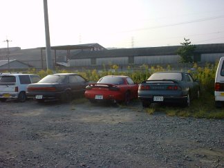 右からH氏のスカイラインGTS−T、K村のアンフィニRX−7、そしてぼくのブルーバード。そういえば、電柱の近くは鳥の糞が落ちてくる危険が高いんだった。動かしとくか。軽自動車は誰のだろう?危険地帯ですよ。白いからいいのか?いやいや。