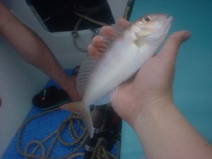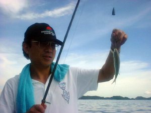 おっとNさんにも来ましたね! あ〜ホント天気はいいし、波もそんなにないし、たまんね〜。ボウズの心配なんかして損した。 釣れて釣れてまた釣れて。笑いジワが増えてしまふ。 おうっ!こりゃ〜なんすか?食えるよね、食えるよね。ツラが鯛っぽいしさ。体はカマボコっぽいし。(そりゃ関係ない) メインで釣れるのは2種類かなあ。 あ、hanataisha さん、それは・・・・・・、 カワハギ・・・・・・の仲間っすね! ん? って事は、底はどうなってんの?岩場か・・・・、 ハッ!珊瑚礁か!