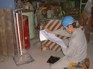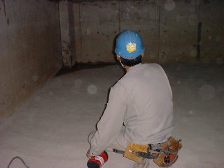 下りたらこんな感じ。写真はフラッシュをたいているのでわかりにくいかもしれませんが、中は真っ暗で、懐中電灯の明かりがたよりです。 こんな部屋の、四隅の高さと四辺の長さをひたすら測っていきますが、部屋の高さが1500mmぐらいなので屈んでの移動となり、腰がつらいぜ。