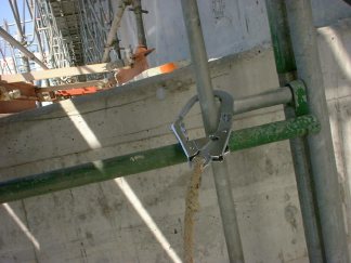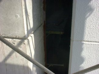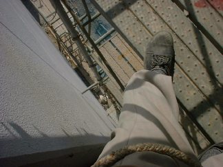 写真の奥の赤い埋込鉄骨にピシピシ墨を打っていきます。右側にも向かい合って鉄骨があり、それにも打ちます。打ち終わったら上へ移動するけど、足場をよじ登って行ってはいけません。N井さんに怒られます。少し離れたところに足場内の階段があり、そこを上っていきます。