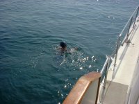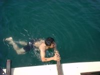 海に出てたメンバーが帰ってきた。お疲れさんです。 支店長、その年代物っぽい海パンが、「海を純粋に楽しみに来た。」って感じが出ててイイですぜ。 あ、海人M桶さんの写真撮るの忘れた。スミマセン。 さて昼飯。料理人S水さんが準備してきたミートソースパスタ (何故じゃ?) 鯛飯、みそ汁、取れたての魚介類、その他もろもろが後部デッキに繰り広げられる。グレート! 食って飲んで食って飲んで、もー腹いっぱい! ミートソース美味かったっすよ、S水さん。
