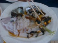 さて昼飯。料理人S水さんが準備してきたミートソースパスタ (何故じゃ?) 鯛飯、みそ汁、取れたての魚介類、その他もろもろが後部デッキに繰り広げられる。グレート!