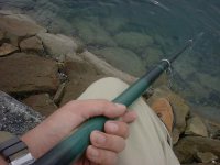 波止の上に腰掛けて、じわりと開始。1号の磯竿でやろうと思ってたんだけど、竿袋を開くと竿先が折れていたのでしかたなく4号竿を出す。ハマチが来ても大丈夫だ。(来ない来ない) でも敏感なチヌは掛かってくれないかもしれないな。