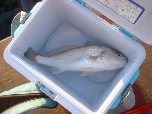 「グチ」でした。ぐーぐー鳴くので、「ぐーぐー」とも呼ばれたりしていますこの魚、さぞかしいい引きだったでしょう!だいたい斜めにしないとクーラーに入んないっすね。ぼくもがんばろうっ。