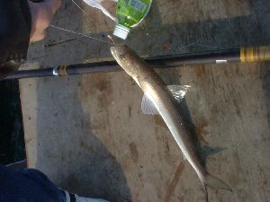 ハゼっすか?おもりが重たいせいもあるけど、上げるまで釣れてるのかどうか分かんなかったよ。 「ちぇ。」と、舌打ちして海に帰す。防波堤釣りならゲットかもしれませんが、ここまで来てるんだからやっぱり大物を狙いたいっす。甘い? こんどはT田くんの竿にヒットあり! 「これ、なんすかねえ。」というので、行って見ると「エソ」でした。かまぼこの材料であります。歯が鋭いんだよね。それにしても皆さん色々上げますね。 ぼくにも一発ガツンとでかい奴が来ないかな〜、と底を探っていたら来ました、ガツンと!