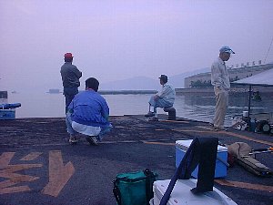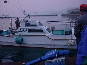 5時出港の予定だったのだが、船の来る気配が無い。海を見つめながらひたすら待つ我々6人。 この辺りには以前一度来たことがある。去年の冬、12月の下旬だったか、H氏・やいさんが釣りに来ててそれを観戦してたんだ。やいさん、カレイを釣ってたっけなあ。 今日はメバル釣りということだけど、エサは船頭さんが用意してるらしい。何かな、モエビかな。などとぼんやり考えていたら、やって来ました、船。 6人なら余裕ありそうですね。うんうん。早速乗り込んで出港です。