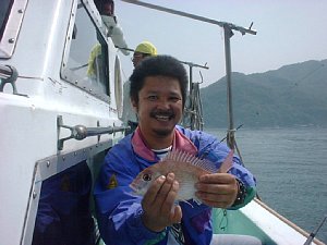 タイっすよ、タイ。塩焼きサイズですけど、いいっすねえ。竿の動かし方の違いなんでしょうか。うらやましい。