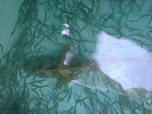 特別待遇でエサ用の生簀に放されたこいつ。約40cmの「アコウ」です。測量屋の社長、O野さんが釣り上げました。おみごと!