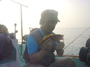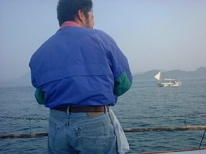 K原さんは左舷後方。K原さんとやいさんに挟まれる格好で、K原さんの親父さん。