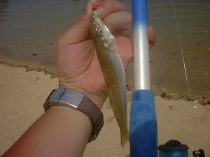 目をこらして波打ち際5mくらいを見てみると、キスの子がうようよたむろしておりました。ちょっとまだ早かったのだろうか、時期。もう少し大きくならないと持って帰るのが忍びないよなあと思いつつ、ちょっと遠めに投げてみる。と、それなりのやつがかかりました。