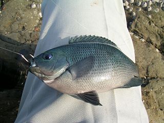 南北に長い磯で、釣るのはだいたい先端から東面になります。西面はちょっと釣りにくい感じ。 撒き餌をしながらクロ(メジナ)を待ちます。 撒き餌をして程なくしてクロがヒットしました。型は大きくないけどそれなりに楽しめる引き。これは塩焼きクラスでしょうか。 |