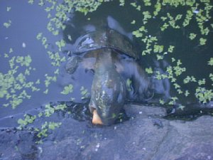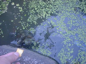 「今年も水草が繁殖してるな〜。」とか思いつつ、よく見ると水面に亀の鼻を発見。パンパンと手をたたくと、5・6匹の亀がゆらゆらと泳いで近づいてきた。