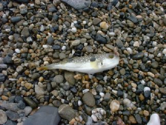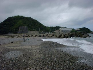砂浜と言うよりは砂利浜か。雲行きは依然怪しいが、とりあえずアオイソメの投げ釣りでスタート。軽く当たりはあるが、どうもアイツのような気がする。