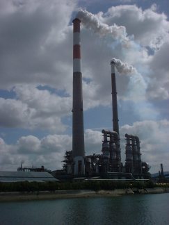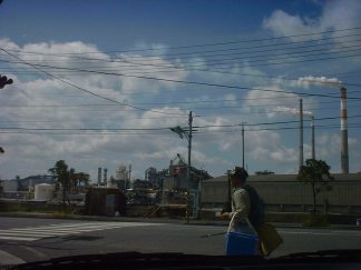 煙突に近づくにつれ、それがぼくらの錯覚であったことがわかってきた。 あまりに大きい煙突だったので、遠近の感覚がおかしくなっていたのだ。正体は、町外れにある大きな工場の煙突だった。 「煙突撮っておこうよ」 と、Y元にカメラを渡した。 パチ。 「あ、おっさんが入った。」 「ん?これって煙突が右に寄ってない?」 「うん。工業地帯の様子も入れとこうと思って。」 「なるほど。・・・・・・ もっと寄ってみようか、煙突。」 「うん。」 パチ。 「これでよしっと。でもこれって何の工場だろ〜ね。」 (MENU) (NEXT)