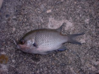 やっぱり。スズメダイだ。針が沈む前にこいつが食いついてしまう。いくら撒き餌をしても次から次へとこいつが湧いてくる。くう〜。